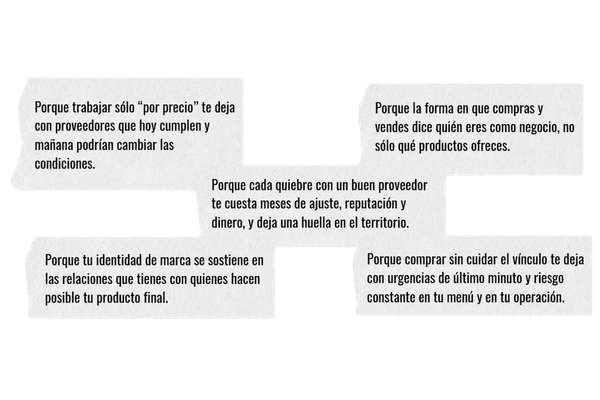 Que se sostiene por sí misma: puedes contar con honestidad de dónde viene lo que ofreces y cómo cuidas a quienes lo producen, más allá del “compramos local”.